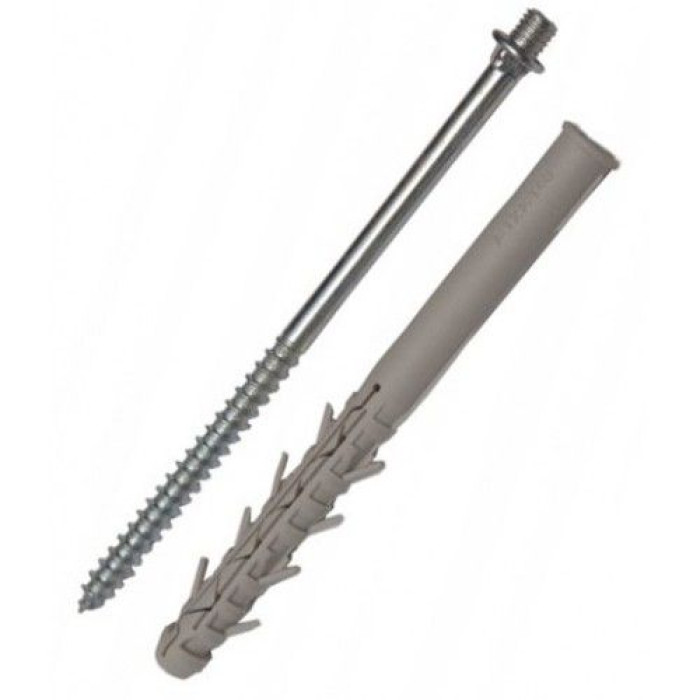 Винт-шуруп с дюбелем 105 мм. Комплектуется вместе с кронштейном трубы. Также есть шурупы длиной 140 мм и 200 мм.