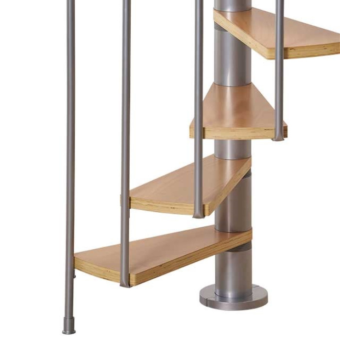 Винтовая лестница Долле Калгари может быть в трех цветах - антрацит, серебро, белый. Металлические детали лестницы покрыты специальной порошковой краской, что обеспечивает стойкость к стиранию и долгий срок службы. Деревянные ступени изготовлены из бука и обладают повышенной влагостойкостью, устойчивостью к износу, не расслаиваются и не стираются при частом использовании. Ширина ступеней рассчитана на комфортабельный спуск и подъем. Шаг ступеней 20,4-23,4 см, толщина - 3,5 см.